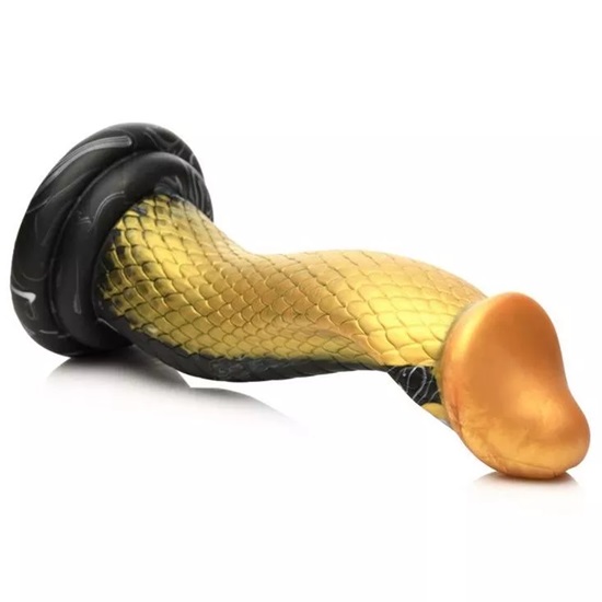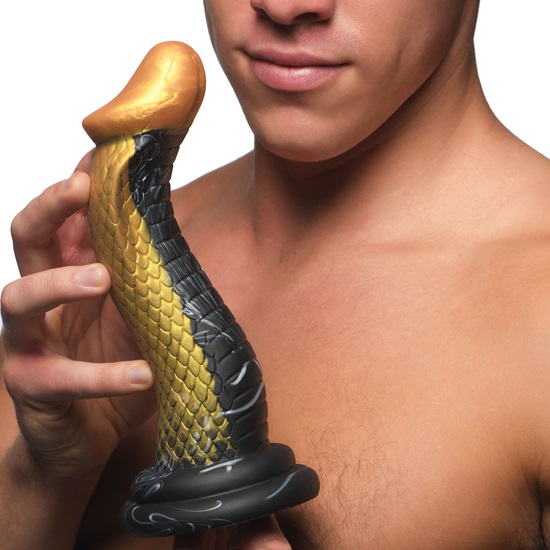 The royal king of cobras, the Golden Snake of your dreams has arrived! The brilliant 9″ golden mamba silicone dildo, shining gold and black body has an exaggerated S-curve that will hit your G-spot or P-spot. The wide hood at the top stretches you open and adds extra, soft and scaly texture while the round, dong-shaped head slides easily inside.